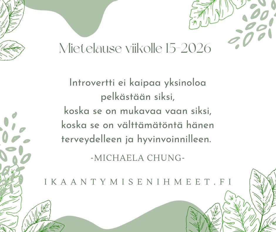 Introvertti ei kaipaa yksinoloa pelkästään siksi, koska se on mukavaa vaan siksi, koska se on välttämätöntä hänen terveydelleen ja hyvinvoinnilleen. -Michaela Chung-