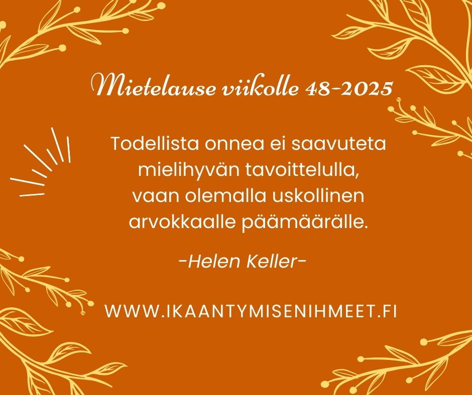 Todellista onnea ei saavuteta mielihyvän tavoittelulla, vaan olemalla uskollinen arvokkaalle päämäärälle. -Helen Keller-